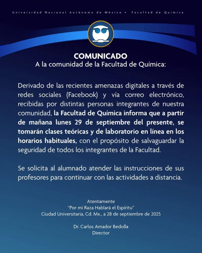 La Facultad de Química anunció que presentará denuncia formal por las amenazas recibidas, mientras las autoridades de la UNAM activaron protocolos de seguridad y solicitaron vigilancia permanente en los planteles.
