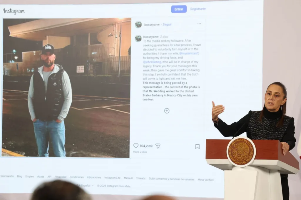 LANOTA–  En la conferencia de prensa mañanera, en Ciudad de México, la presidenta Claudia Sheinbaum proyectó en pantalla la fotografía de Ryan Wedding, exatleta olímpico canadiense acusado de narcotráfico y asesinato. Con esa imagen, atribuida a un supuesto representante del detenido, el gobierno buscaba demostrar que el fugitivo había decidido entregarse “por sus propios pies” en la embajada de Estados Unidos.